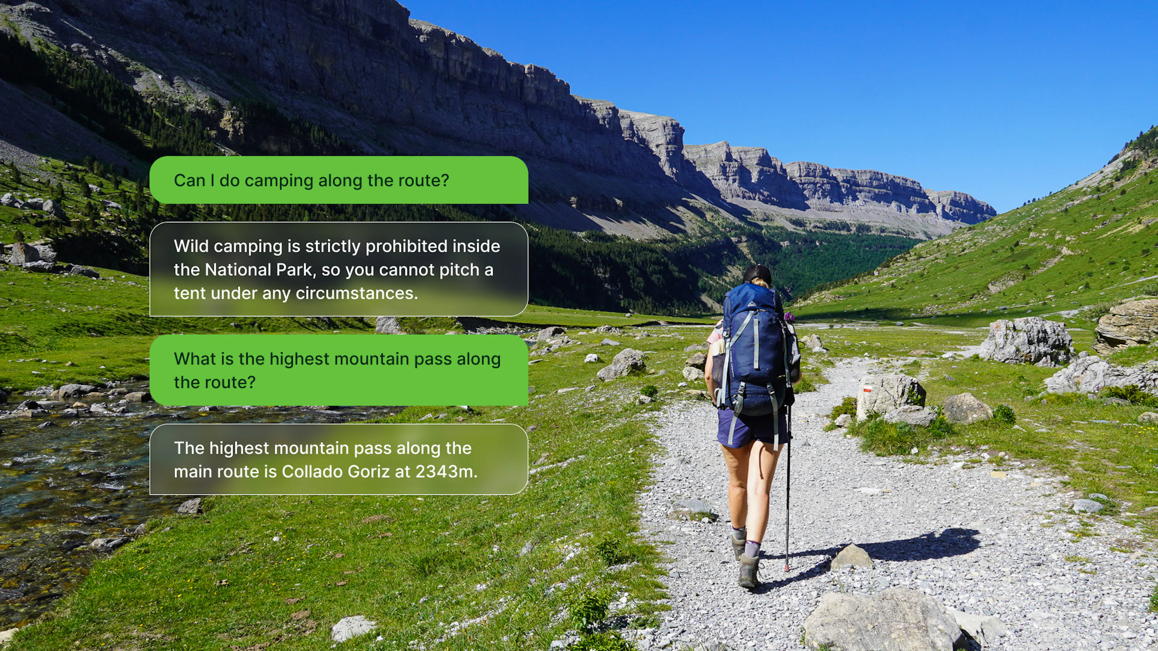 The first feature is a Trail Assistant built directly into your itinerary view. It knows your full plan - every stage, every marker, every stat - and you can ask it questions about your hike in plain language.