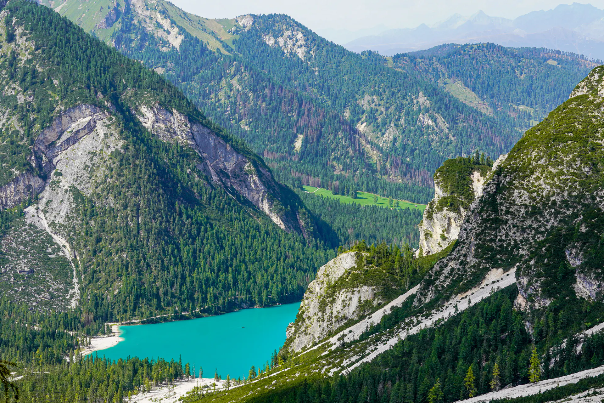 The standard start of the Alta Via 1 is Lago di Braies (also called Pragser Wildsee in German), a mountain lake at around 1,500m in South Tyrol. It's genuinely beautiful, emerald green water, limestone cliffs rising on three sides, an old wooden boathouse. You understand why it's one of the most shared places in Italy.